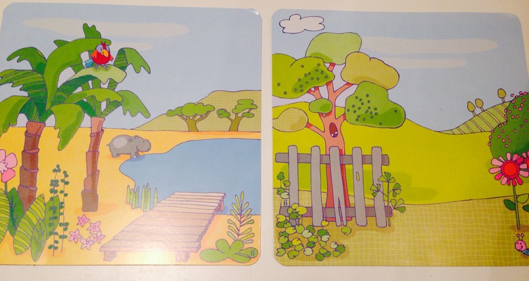 Меня ждала металлическая коробочка примерно 25х25 см (может побольше). В которой было две картонные карточки с разными сюжетами, двусторонних, итого, 4 сюжета, в которых может участвовать наша куколка: кухня, школа, тропический пейзаж и наши родные поля с деревом. Вот они: