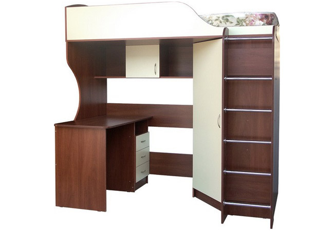 В этой не нравится стол и эта лестница с ящиками. Занимает много места в выдвинутом виде (как понимаю она выдвигается и задвигается), ручки ящика таки мне кажется мешают ноге. Материал неясен.