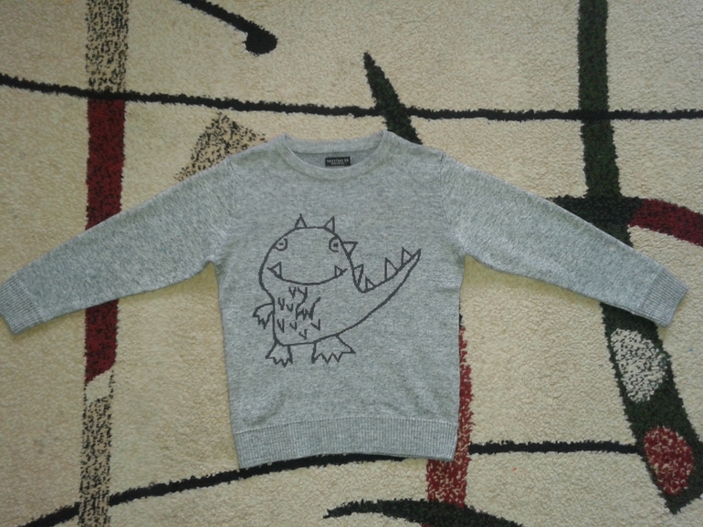 Джемпер р-р 104-110 очень мягкий и с любимым динозавром. Не могла не заказать.