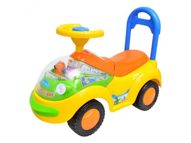 у нас как первый (цвет другой), самый пик катания начался ближе к 2г. Сейчас на улице катаемся на нем. Подарили на 1г,с музыкой, когда не умела кататься просто слушала музыку и мы сами ее катали.