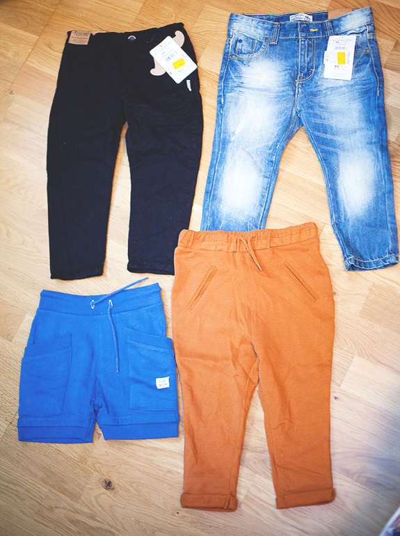 Шорты 249 рублей,в итоге таких шортов у нас 3 пары!Двое черных и одни вот такие синие)Разного размера,конечно)В них удобно кататься на беговеле,и смотрятся они оч круто)))Черные штаны 199 рублей,джинсы 799,кирпичные штаны 299)
