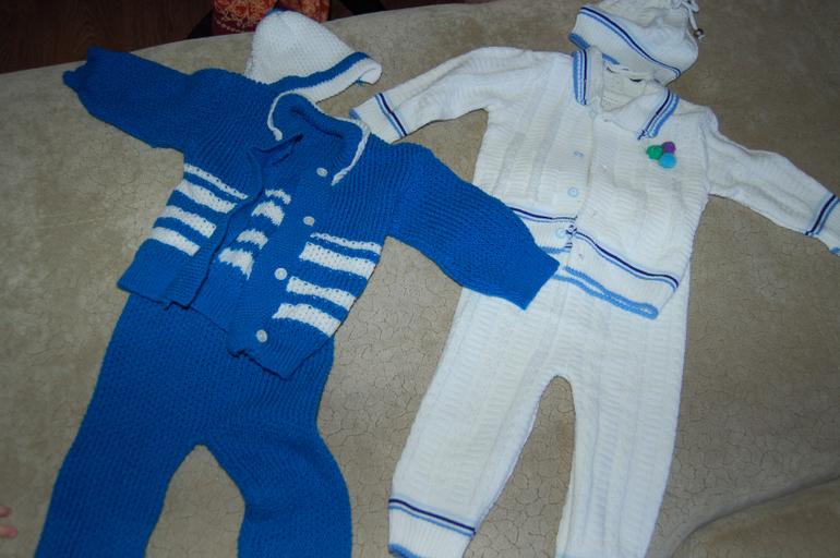 Имеются два вязанных костюма - куда их приспособить не знаю) Беленький побольше размером.