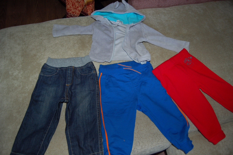 Толстовочку с ушками и синие штаны носим уже сейчас, когда прохладно. Красненькие - с начесом.