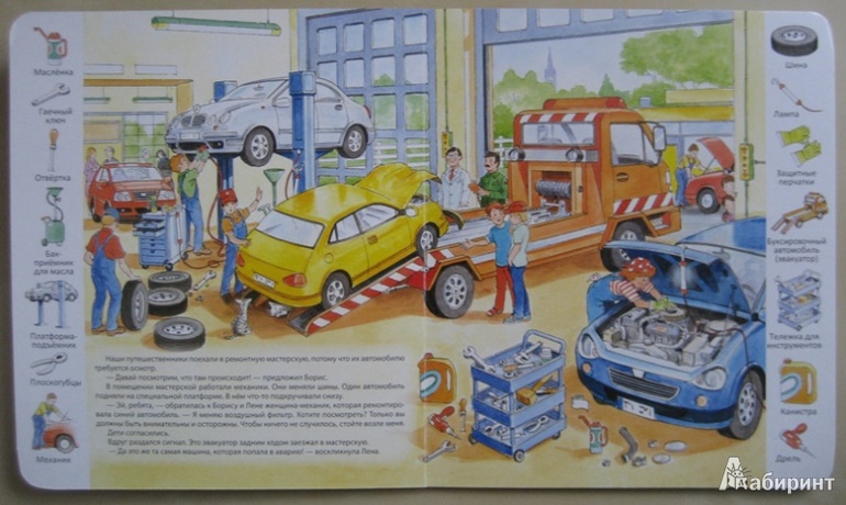Картинки очень понятные, красочные, не как фотографии, а нарисованные. И текст тоже есть (немного, но достаточно), а на полях нарисованы отдельные предметы с картинки, и у нас уже получается их искать! А еще - полностью использована вся площадь книжек - даже обложки!
