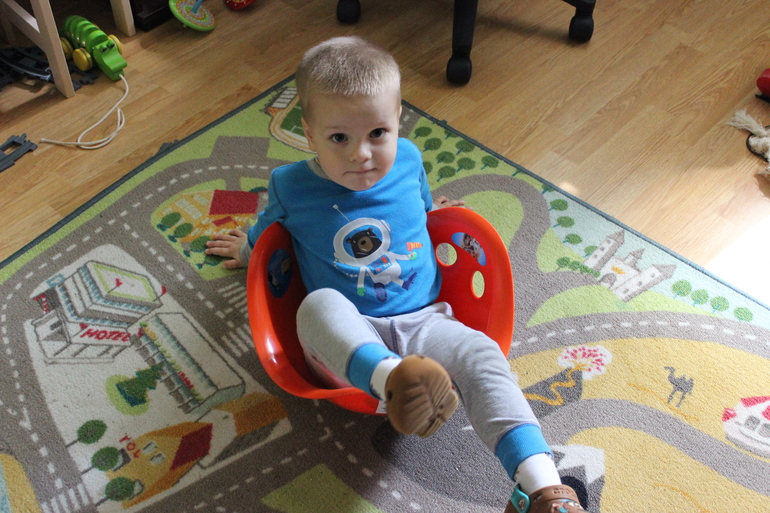 Костя готов целыми днями кататься в нем, раскручивать его вместе с какими-нибудь шариками и машинками, играть в ку-ку, качаться, ездить или просто сидеть)). Первое время у сына не получалось держать равновесие, но он скоро научился, теперь крутится в свое удовольствие! Конечно будет лучше, если раскручивает мама, ну или папа).
