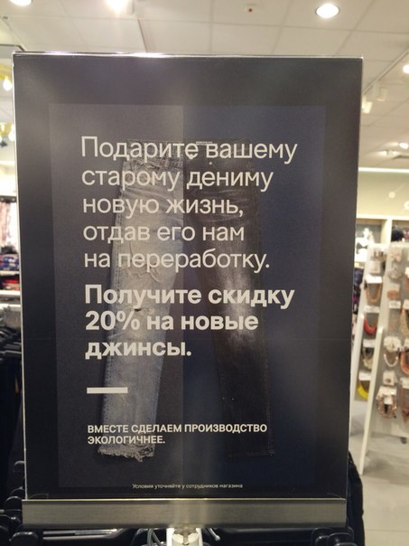 Следующая акция в сети " HM " .Очень меня заинтересовала, как приятной скидкой, так и самой идеей о переработке . Такие объявления по всему залу , и на детской одежде в том числе.