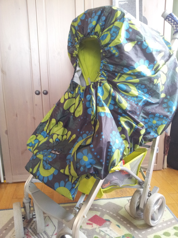 Как ни хотела я избавиться от Элодиевского дождевика из-за его парашютности (во время ветра надувается он очень сильно, особенно на Версе). Но всё же он очень универсален. Хорошо садится на все наши коляски. Вот и на Грува отлично сел :-)