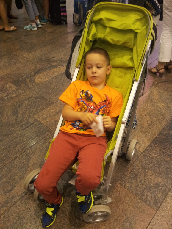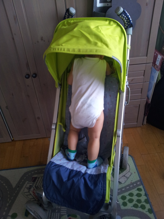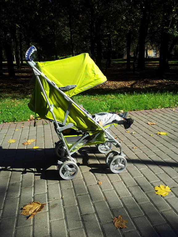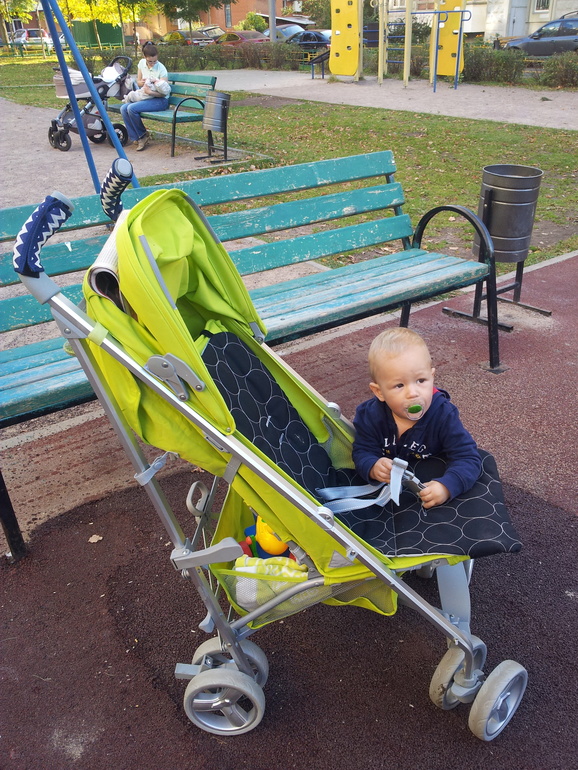Продав весной свою Зину, решили мы не дергаться и откатать лето на Версе, для которой был куплен голубенький Буговский летник (спасибо этому сообществу за подсказки, сама бы ни в жисть не додумалась апгрейдить Версу). Да не тут-то было. Только приехали в Подмосковье на дачу, тут же ручки зачесались покатать что-нибудь полегче. Деть уже подрос и стал настоятельно требовать пеших прогулок по детским площадкам, Версу таскать становилось напряжно. Да и подумалось еще, что на отдых лететь в компании Версы GT, чемоданов и троих детей, как то тяжеловато. Так что, пришлось в очередной раз вознести хвалы этому сообществу, отдельное спасибо Марине за ее видеообзоры и эксперименты с колясками, и выбрать себе что-то полегче Версы. Хоть и зарекалась я после среднего, не катать больше трости, но описания Грувика меня покорили. Определяющими для меня стали 3 его параметра. Большие колеса, не очень стандартные для тростей, амортизация. Это нам очень нужно было, чтобы кататься по дорогам Подмосковья, чаще проселочным, да и на отдыхе, по пляжу нужно проехать, в старой части города, где чаще всего мы гуляем, булыжная мостовая. И еще третий параметр, это грузоподъемность, заявленная до 25 кг. Это как раз самое оно, когда наш средний кабанчик пяти с половиной лет любит присесть на колясочку отдохнуть, пока младший брат тусит рядом на своих двоих. Ну и живы еще воспоминания о том, как средний потребовал в 3,5 года коляску на отдыхе, устав от наших многокилометровых прогулок по сложной местности и булыжным мостовым и за неделю до окончания отдыха, купленная трость сломалась, не выдержав 16 кг ребенка и тряски по булыжникам. В общем, по-быстрому купили мы Грувика. Хотели, правда темно-синего, но на складах во всей Москве остались только салатовые и оранжевые. С салатовым и жить веселее, подумали мы и заказали его. В тот же день, как муж привез наше салатовое чудо из Москвы, я дрожащими от нетерпения ручками стала вскрывать коробку и собирать Грувика на прогулку. Конечно, после Зины и Версы, катать трость непривычно. Всё же есть разница между целостной ручкой и двумя рожками, но тем не менее, ход у коляски достаточно хороший. Хоть и трудновато, но кофе можно попить, управляя коляской одной рукой. Со средним у меня был (и сейчас стоит на балконе на всякий случай) silver cross fizz, дак им нереально одной рукой управлять. Амортизация чувствуется. И в Подмосковье и в Болгарии откатали замечательно. На булыжниках не сильно колбасило, поэтому гуляли в старой части города регулярно. Материал на колесах мягкий, не гремит погремушкой. Удивила высота капа и спинки. Мне, кажется, что там четырёхлетку можно усадить и он не будет упираться в кап. Конструкция у коляски реально надежная, даже сомнений не возникает, что выдержит заявленные 25 кг. Был на отдыхе момент, когда надвигалась гроза и мы бежали до дома, младший отказался сидеть в коляске, старшая дочка взяла его на руки, средний тут же забурился в коляску, и таким образом мы бежали до дома. Коляска ехала под 23 кг среднего очень резво :-) Видимо за счёт своей конструкции коляска крепко стоит и не норовит откинуться назад, в отличие от многих тростей, если на ней висит достаточно нагруженная сумка. Кстати, у колес есть еще один плюс. Передние колеса у Грувика снимаются. Мы это оценили, когда прилетели на отдых и нам нужно было в багажник старенькой В