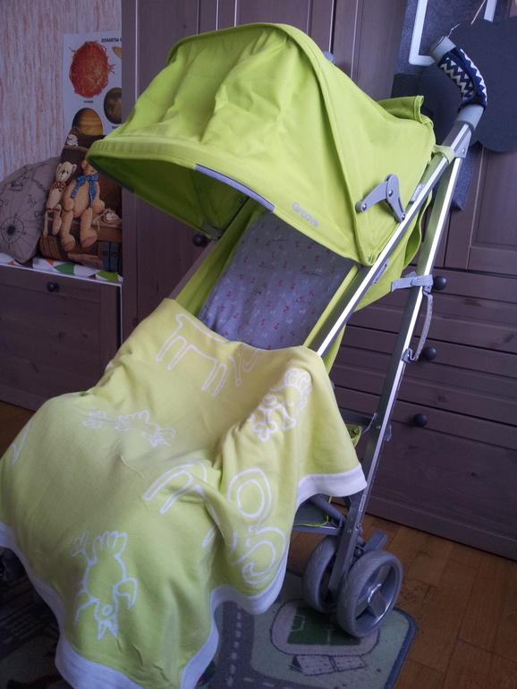 Икеевский пледик идеально подошел по цвету к коляске, летом частенько возили его в корзине, всё же погода у нас изменчивая, бывает и ветрено и прохладно. Цвет на фото не удачно как то передался, пледик тоже яркий, как и коляска.