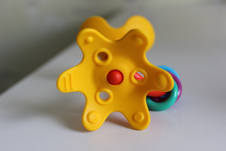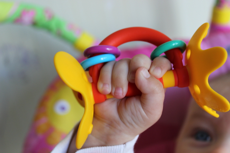 Доченьке очень удобно держать его в ручке, в свои 4 месяца может быть занята им 5-10 мин(ну не всегда конечно, когда в хорошем настроении