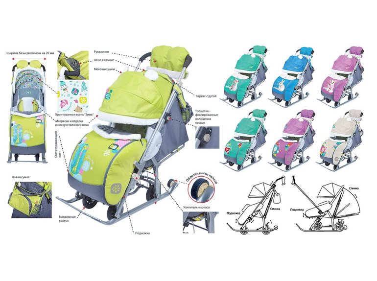 3 положения спинки, перекидная ручка, ремни безопасности( не очень удобные - дорабатывала немного ), силиконовая защита на капюшоне от ветра/снега, 4 маленьких колесика.