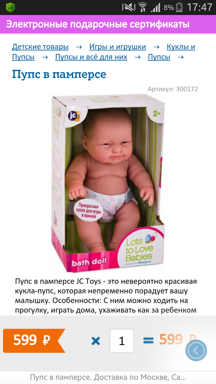 Я его вообще за 400 взяла,недельки 3 назад так стоил.Крестница довольна!!!В первый день и катали и кормили агушей,а потом купаться с ним пошли,а ему все нипочем)))И не пахнет совсем!!! Хорошая игруха!