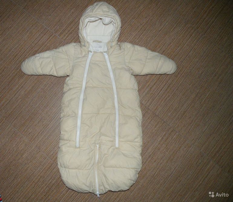 у нас был похожий в этом же размере. Дочь 48 см родилась, конечно, большой был, зато гуляли мы в нём до 10 месяцев))) Зимой сверху конверт из овчины обязательно, одеяло - это слишком холодно. Комбез на обычном синтепон, он ни разу не зима. В автокресле в этом комбезе везли из роддома - проблем не было.
