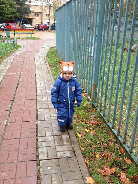 Ну, вкратце о характеристиках и особенностях модели. Утеплителя 160 грамм (две снежинки). На сайте магазина, где я покупала его, есть информация, что комбез рассчитан на температуру от +8 до -3 без поддевы. Мы как раз и начали его носить примерно в +8, на одну термокофточку Joha. Пришли домой теплые и не вспотели. Упомяну, что сын с наступлением осени на прогулках перестал проявлять былую активность, поэтому ходим мы весьма медленно и спокойно.