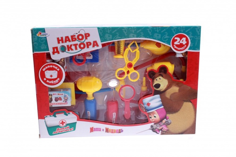 Фонендоскоп щелкает, изображая стук сердца, в шприце пластиковая гармошка, при " уколе" пищит. Осталось докупить чемоданчик, чтобы все это дело хранить.