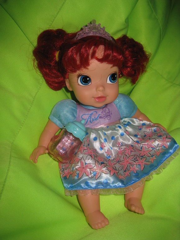 Теперь о кукле: Тело мягкое, руки-ноги- голова резиновые. Личико милое, волосы прошиты хорошо, голова зачем- то покрашена в цвет волос красным? Немного странно, ну да ладно. В комплекте бутылочка и корона на голове, в честь чего гордо носит имя " Каалева")))
