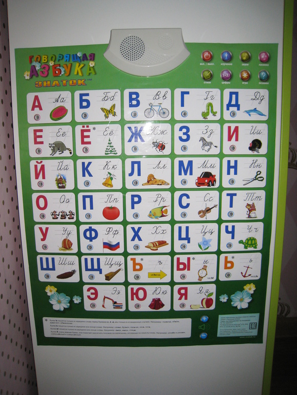Плакат интересный, несколько режимов обучения ( буквы, звуки, стихи, экзамен, песенка). Громкость регулируется. Не очень нравится только, что надо очень точно нажимать на меленький кружок- кнопочку, у Кати не всегда получается.