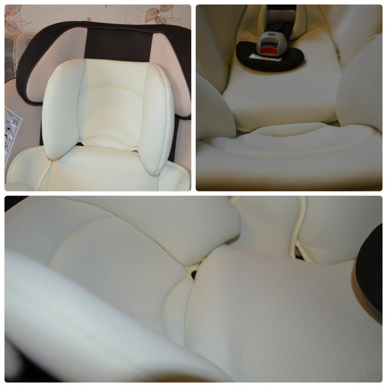 Теперь про малышковую вкладку. По смыслу она оказалась ни чем не лучше той, которая на симфонии. Внешне она помягче, но наполнитель просто объемный, не упругий, т.е. на самом деле не отличается, внутренний объем кресла уменьшает не сильнее. Вставка потолще на спине и потоньше на голове, получается «горка». Не знаю, хорошо это или плохо, когда затылок немного проваливается. Считается ведь, что должно быть ровно все. И опять про защиту головы, у малыша голова только внутри вставки, до подголовника не дотягивается.