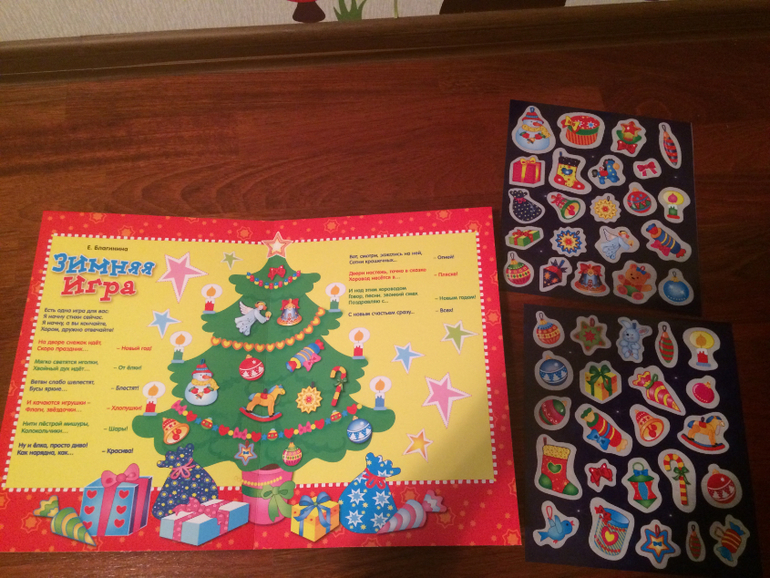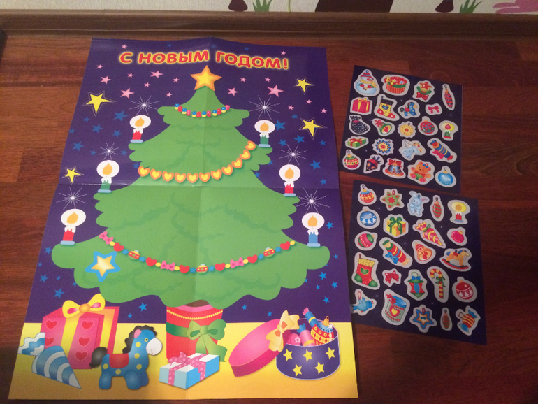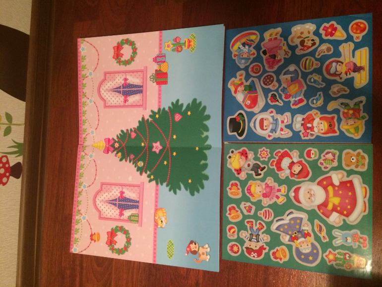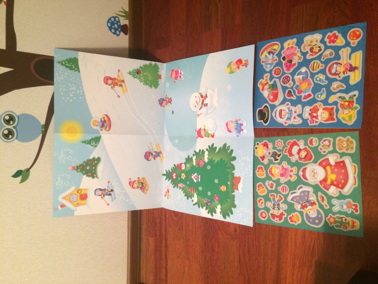 Год назад подруга подарила нам плакат-игру с многоразовыми наклейками изадательства Стрекоза. Сыну очень понравились наклейки и размер плаката! У нас куча книг с наклейками, но Стрекоза явно лидирует! Наклейки хорошие, мы их переклеивать любим несколько раз. У стрекозы несколько разных таких плакатов-и с машинами, и с животными, с фруктами, ... И вот эти две с тематикой нового года! Еще есть с зимними видами спорта, ее я не успела распаковать. Вроде зимних больше нет. Не знаю, почему фото перевернулись, прошу прощения.
