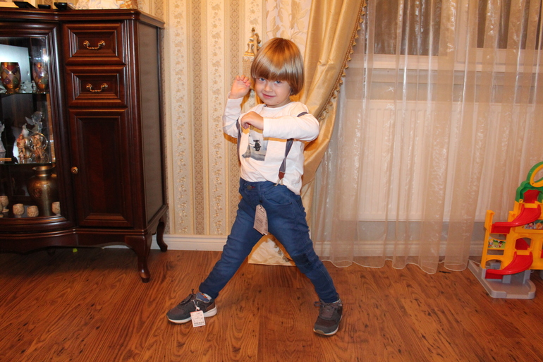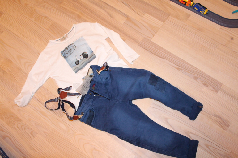 Малыш стиляжный)) Джинсы с подтяжками крутые, а пиджак вообще огонь! Аж тоже загорелась