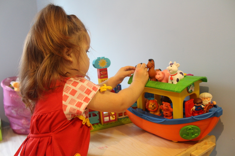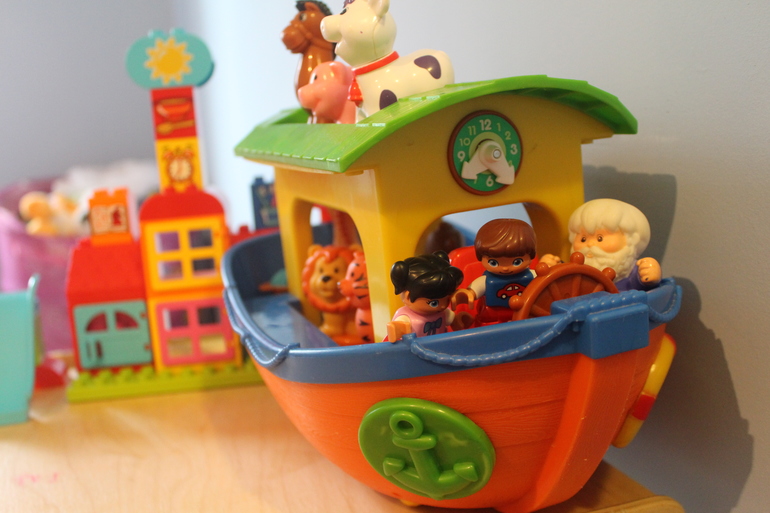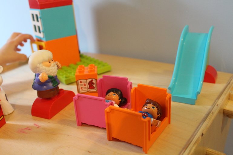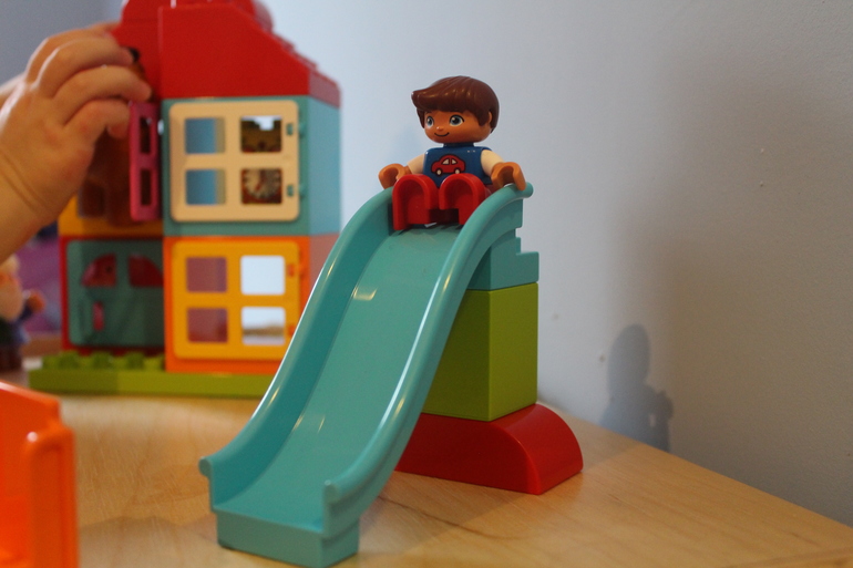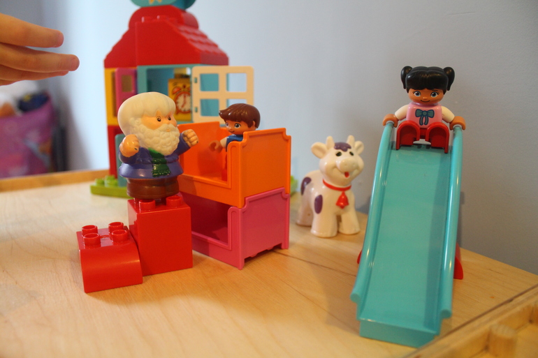 Изучили механизм крепления окошек и дверей, изображения часиков, тарелки с кашей, книжки и стаканчика с зубными щетками. Даже нашли в книжке знакомые буквы! А дальше игра пошла своим чередом. Конечно же, Катеньке очень понравилась горка. С нее катали всех: и Дашеньку, и Тимошу, и фигурки из известного Ноева ковчега, которые, как оказалось, почти идеально подходят по размеру к LEGO DUPLO.