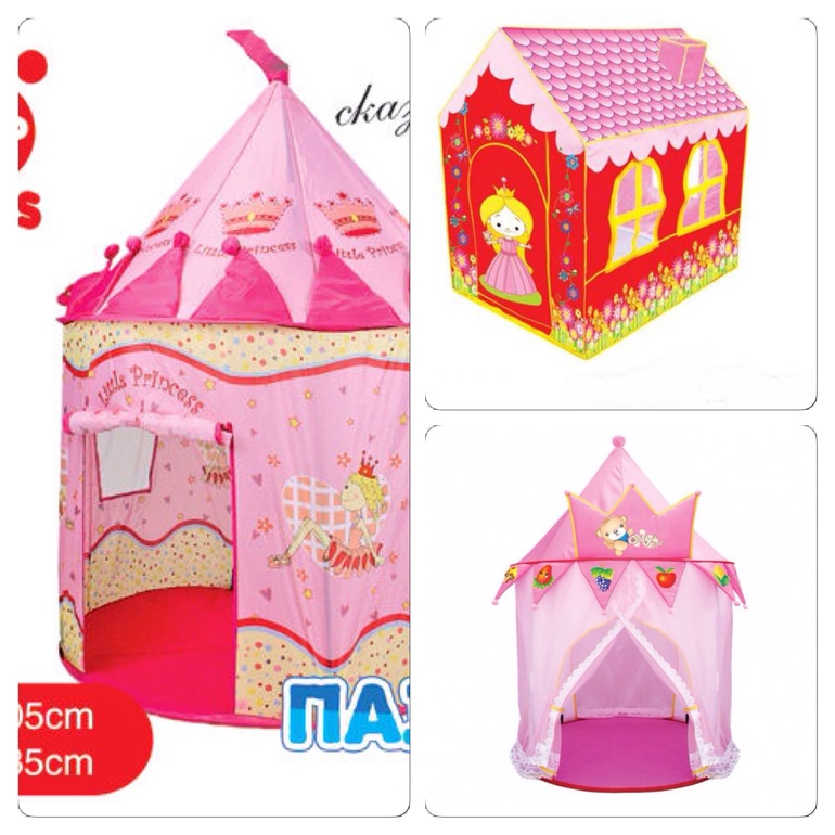 У нас вот такой домик (есть аналогичные с другими и рисунками). Нравится, что довольно высокий, есть окошки-сеточки, компактно и быстро складывается. Есть еще просто палатка с принцессами от john, но в ней душно и сложить-разложить не так просто.