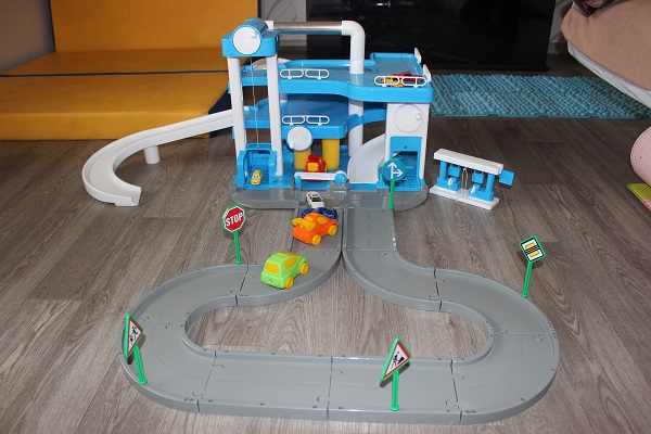 В наборе идут три машинки, заправочная станция, не большая дорога и дорожные знаки.