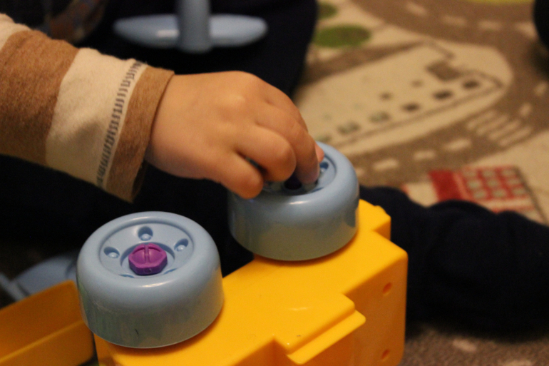 Ну и конечно с первого дня, Костю больше всего привлек шуруповерт, он долго не выпускал его из рук... Кстати, при закручивании шурупа до конца, раздается характерный треск. Все по-настоящему!