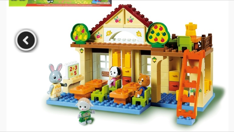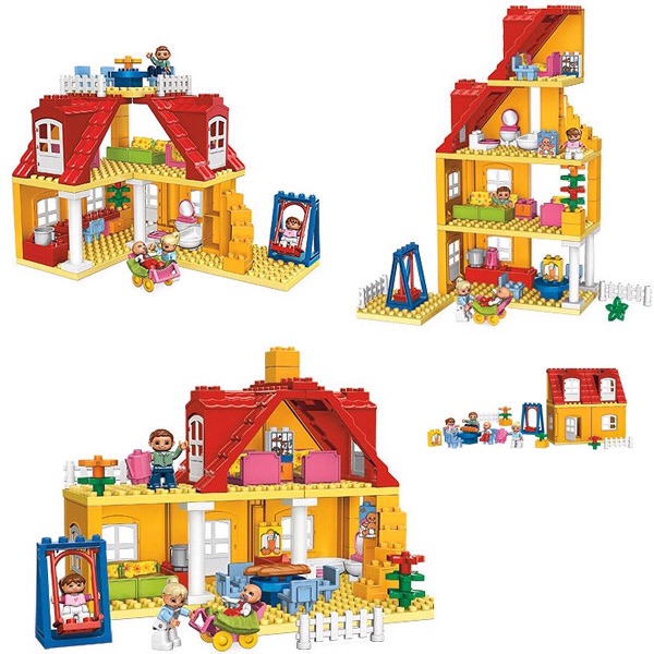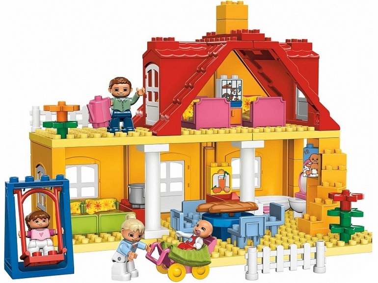 Этот домик Лего дупло( крупные детали).но он снят с производства(((. Есть похожий, но без качелек и коляски.