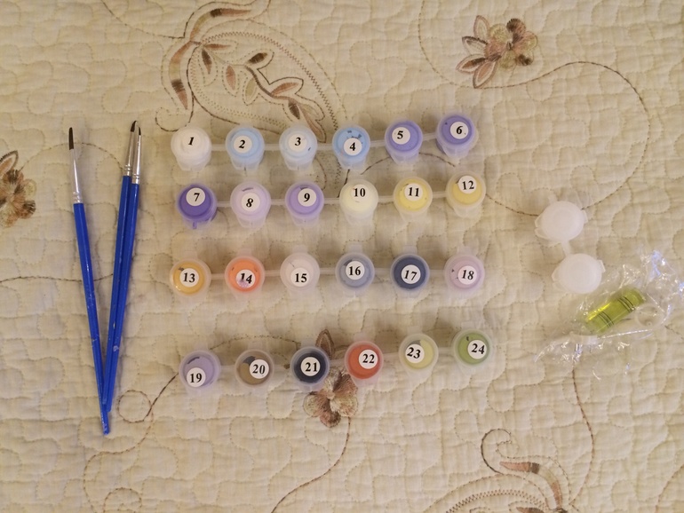 Моя доча не особо любит рисовать, но тут ее прямо затянуло! Подарили ей вот такую картину Живопись по номерам! В комплекте шли краски по номерам что соответствует номеру на холсте и кисточки, и даже крепеж к стене!