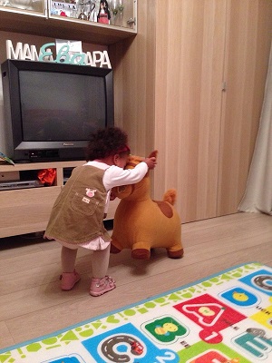 У нас корова, вообще не заинтересовала. Сейчас ребенку 2, 4 , корова низкая, на ней не удобно прыгать. Поищите, что-то другое, поустойчивее. Ослики мне кажется надежнее.