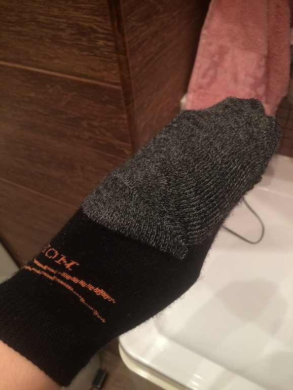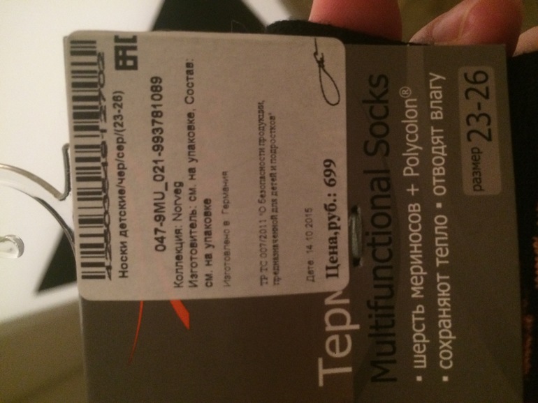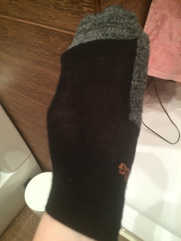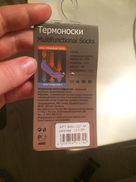 Мы пока так не носим- это на морозы. Могу завтра одеть ему, сфоткать. Вот фото самих носков на моей руке. На ножке они не так просвечиваются сверху, утеплённый низ. Достаточно синтетики для отвода влаги, присутствует шерсть, но они не колючие, вовсе, в отличии от чистой шерсти
