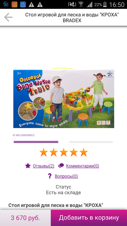 Выбор подарка ребенкуЗаказала на WB игровой столик для песка и воды 2 шт.,один себе один на подарок,а оказалось чтоту одаряемого есть подобный стол.Забирать пойду на пункт самовывоза.Если кто то желает приобрести такой.С удовольствием отдам чтобы скидку не терять.
