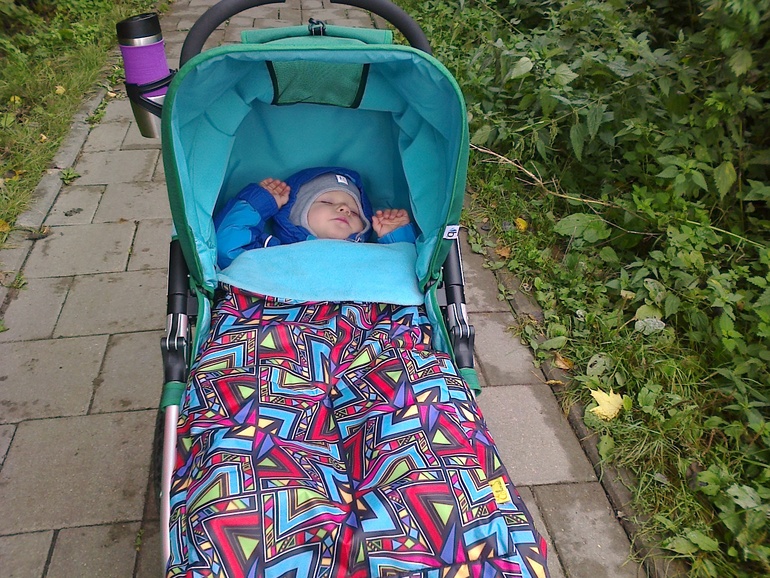 Сейчас у нас дочка другого сезона, потому коляска-прогулка, под накидку в ней плед не засунешь.
