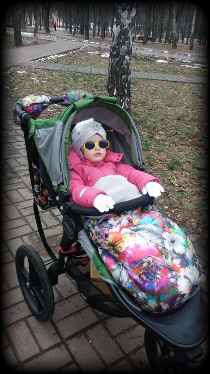 Моя королевна, на улице впадает в лень и вообще отказывается вылазить из-под теплого футика, еще и закрывает кап, если вдруг солнце или просто хочет уединения. А т.к. спокойные возлежания у нас с рождения только в едущей коляске, маме активная ходьба обеспечена))).