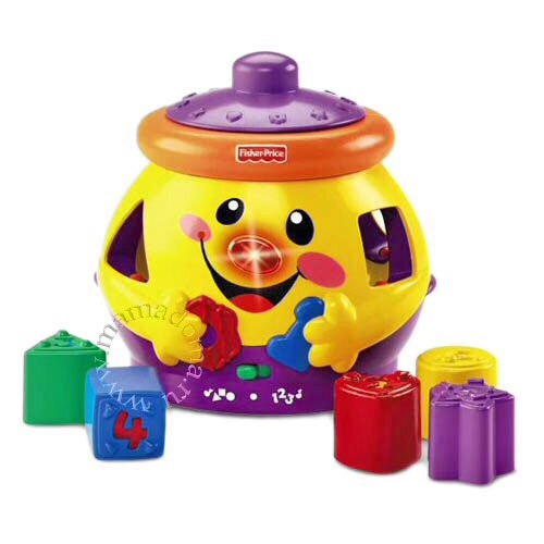 У нас горшочек. Купила на Авито б/у, т.к.за новый жалко было денег. Всё же Fisher Price не из дешевых фирма. Всё работает,там переключать можно на два режима : цифры и фигуры. Когда всовываешь в отверстие, то горшочек произносит что это за фигура (или цифра ). Поёт веселую песенку,мигает носик. Купили мы его давно, а сегодня мой сын первый раз (немного с моей помощью ) вставил круг☺. Чему я несказанно рада. Нам 1 год 2 мес.А до этого только просто вынимал фигурки из горшочка.
