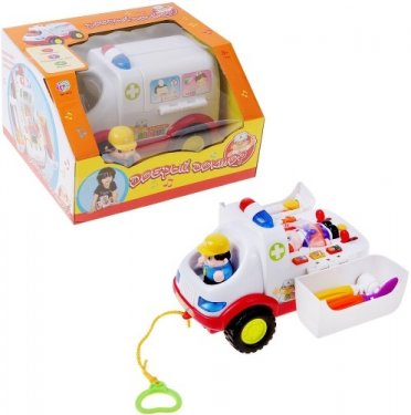Из отзывов: Внутри машинки мед. инструменты: скальпель, отоскоп, термометр и шприц и множество кнопок со звуками: сердцебиения, урчащего живота и кашля. Есть кнопки: кардиограмма, рентген, измерение давления. Есть мелодии. Можно катать машину за шнурок, а нажав кнопку снизу машина едет самостоятельно, звучит сирена скорой помощи. И водителя, и "пациента" можно вытащить. Работает машина от 3 батареек. Батареек в комплекте нет.
