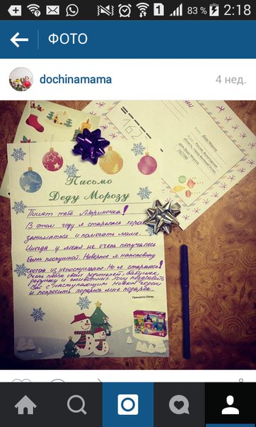 Так вот же месяц назад мы за 47р купили в Фикс прайсе набор для создания Новогоднего письма и приступили...писем было несколько мы в них вклеили фото желаемого подарка (вырезали из каталога дет мир) и раздали всем родным)а они уже должны донести его до Деда Мороза)))ну так думает дочь)