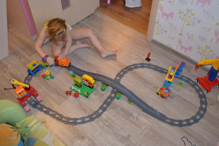 У нас Лего Дупло большой поезд + набор дополнительных рельсов.
