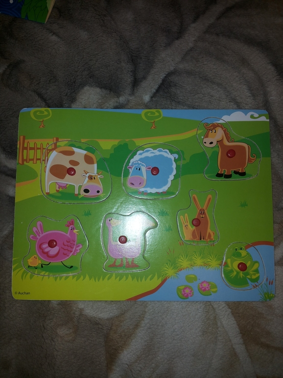 Но сами вкладыши мне очень понравились, фирма Beleduc, краска не облезает, в отличие от Melissa&Doug; (у нас есть их игрушки деревянные, очень быстро облупливаемая краска), дерево приятное, всё ровненькое, гладенькое. Брала с большой скидкой, так дорого для меня. У нас в магазине через дорогу продаются вкладыши Томик, качество, конечно, не супер-супер, но всё равно малыши всё кидают и грызут, куплю их вкладыши, там есть по 3 фигурки.