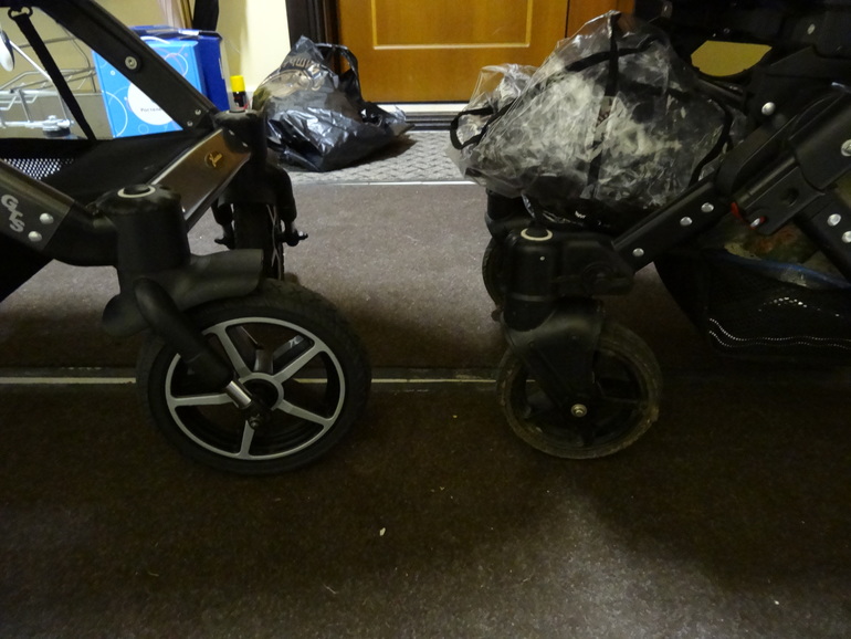 Минусы: вес , ребра прогулочного блока 2016 стали короче. Из-за этого тяжелее добраться до кнопки бампера при положении лицом к маме ( используем для дневного сна с бабушками в парке, им так спокойней))), посередине ручки железка, не очень приятно везти одной рукой, да и вообще это мне пока сложновато, все-таки деть уже крупнячок... Может привыкну, не знаю. Кстати, ширина колесной базы сзади у випа 61 см, а у GTS 58. У нас нет пандуса и лифт широкий,но многим это важно. Мне показалось, что она не так устойчива как вип, может из-за того, что выше, а может из-за ширины более узкой.. А! да, на блок от GTS сложно закрепить мешок, задние железные балки прикручены к спинке намертво.