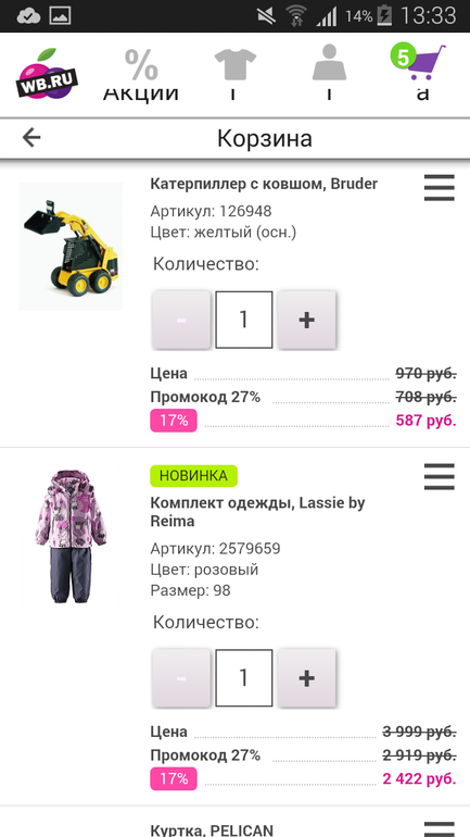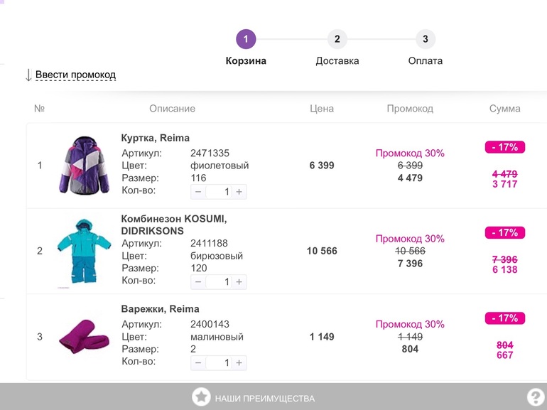 Распродажи. Скидки. Акции.Сегодня скидка 30% на осень-зима действует на reima и котофей, 30% на все аксессуары, 25% (27% при заказе от 3000) на раздел все для детей( днйствует на новинки lassie и некоторые модели bruder) ну и промокоды с сайта. Если кому надо, личная скидка 17%, могу помочь с оформлением заказа. Все вопросы в личные сообщения)