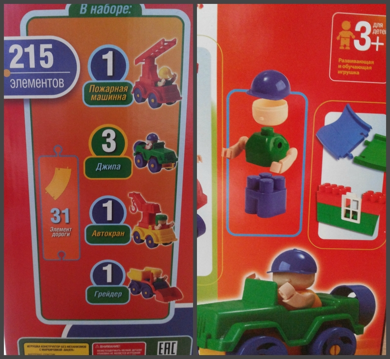 на коробке заявлено, что конструктор содержит 215 элементов, я верю надписи, и пересчитывать не стала, да и не успела бы, т.к. папа с сыном меня к нему не подпускают.