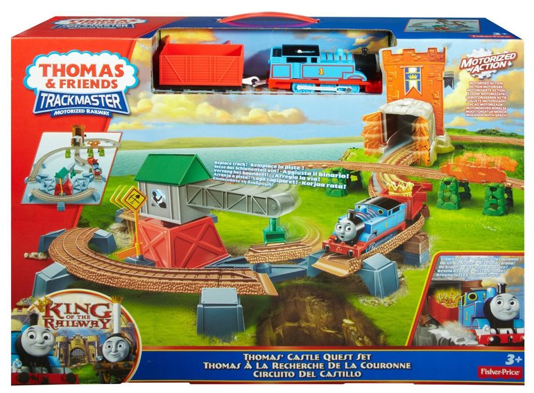 1. Набор Томас и его друзья "Король железной дороги". покупался данный набор на распродаже в детском мире, в июне, стоимость его составляла 1865 рублей, полная стоимость набора, около 4000 рублей. К сожалению, сейчас набора в России нет в продаже, но, я все же его покажу, и кто стоит перед выбором жд дороги, сможет определиться. Сюжет игры - корона заточена в башне, паровозику Томасу надо ее спасти, преодолевая преграды.