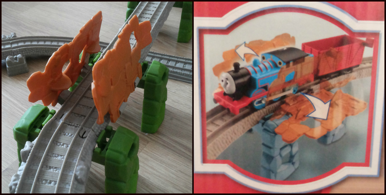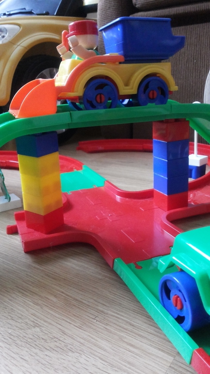 мост, безусловно, изюм набора, спускать с него машинки - любимая фишка, но... стоит он не крепко, на кубиках конструктора, по сему, сам может требовать ремонта