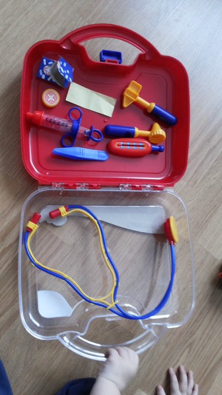 в набор входят сам чемодан, фонендоскоп, шприц, пинцет, градусник, молоток, штука для заглядывания в ушки, баночка для мази, пластырь, блокнотик для записей (который мы уже изрисовали)