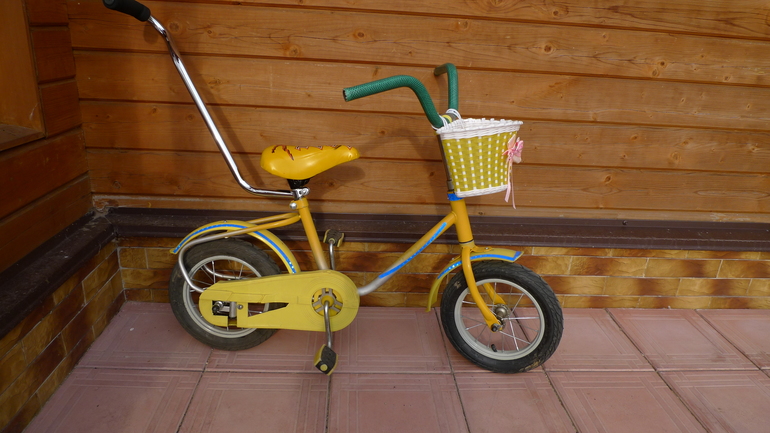 Ручку отдельно покупали в Спортмастере, корзинку заказала с Алиэкспресса, дочке очень хотелось) А на руле кусок садового шланга, так получилось)