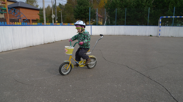 Это типичный "Дружок", колеса 12 дюймов, руль изогнутый, без рамы, за счет этого очень легкий. Весной купили, рост был около 100, сиденье в почти самом нижнем положении (чуть подняли только чтобы ручку вставить, с ней легче учить). Кроме седла регулируется также высота и наклон руля.