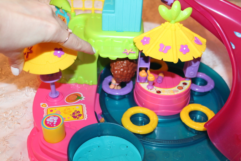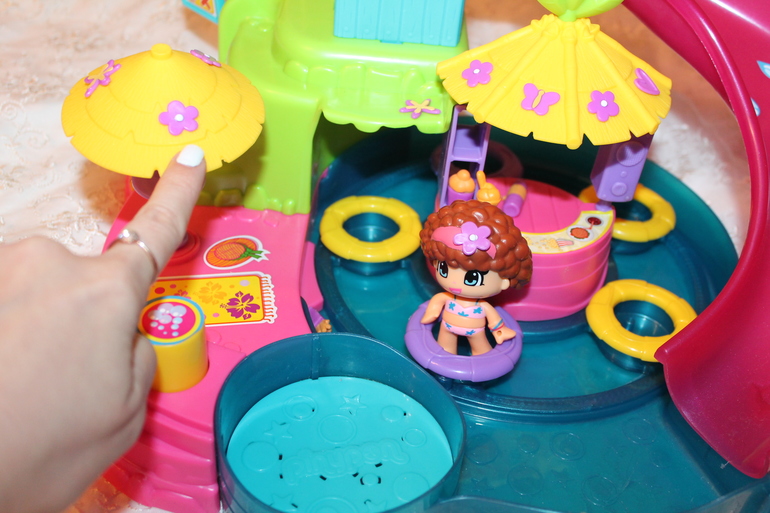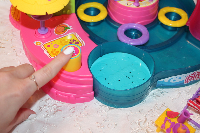Есть джакузи. Когда нажимаешь на эту кнопку, в бассейне начинает бурлить водичка. Но кнопка туговато нажимается, дочка справляется двумя руками