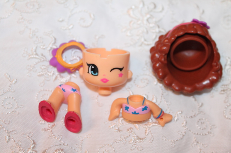 На ободке у куклы цветочек можно менять на другие предложенные аксессуары: бабочки, сердечки и т.д. В левой руке у нее специальная дырочка, в которую можно с легкостью "дать покушать куколке фри, попить коктейль или взять с собой сумочку". Разбирается она на несколько частей, за счет этого голова у нас часто "слетает с плеч" куклы. Но, возможно, это еще из-за волос: их много и они тяжеловаты. Посмотрим как поведут себя остальные куклы.